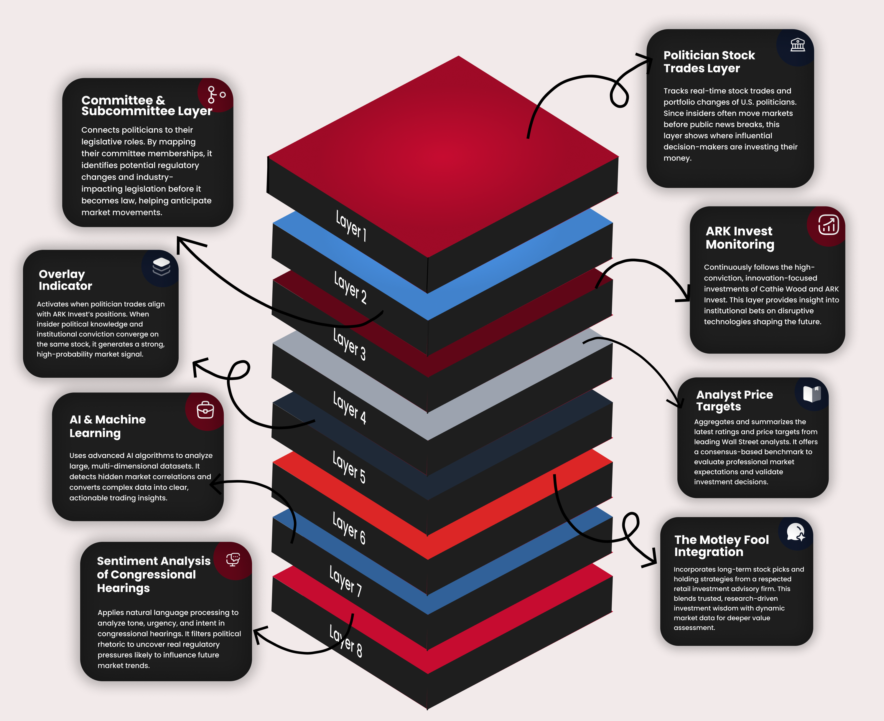 Consists of 8 layers: Politician trades, Committee & Subcommittee, ARK Invest bets, Analyst price targets, Overlay indicators, Motley Fool holdings, AI/ML, and Sentiment Analysis of Congressional hearings.